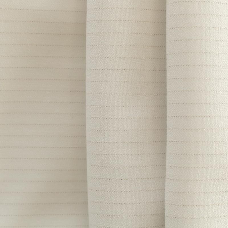Достаточно плотная костюмно-плательная ткань, мягкая и приятная на ощупь, немного тянется, формоустойчива, хорошо драпируется и образует мягкие складки. Элегантный молочный цвет ткани украшает тончайшая золотистая люрексная вертикальная полоска. Ткань отлично подойдет на костюмы, юбки, брюки-палацио, платья, жакеты.