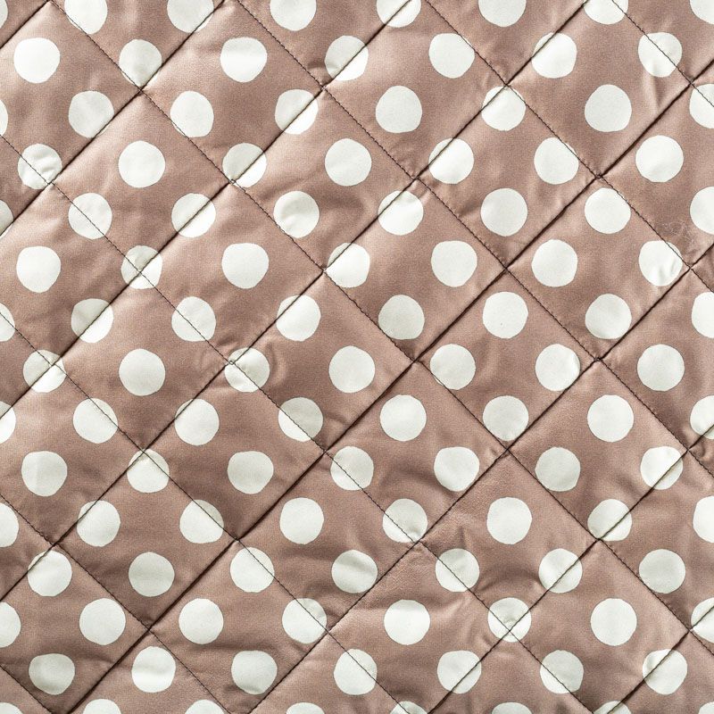 Трехслойная итальянская курточная ткань теплого серого оттенка в белый горох, простеганная не крупными ромбами размером 3х3 см. Нижний слой черного цвета, заменяет подклад, средний слой - синтепон, верхний слой - матовый полиэстер, напоминающий болонь. Ткань легкая, пластичная, хорошо драпируется. Прекрасно подойдет для  пошива легких пальто, курток, бомберов, жилетов, накидок-кейпов, объемных сумок, одежды для домашних питомцев, туристического снаряжения.