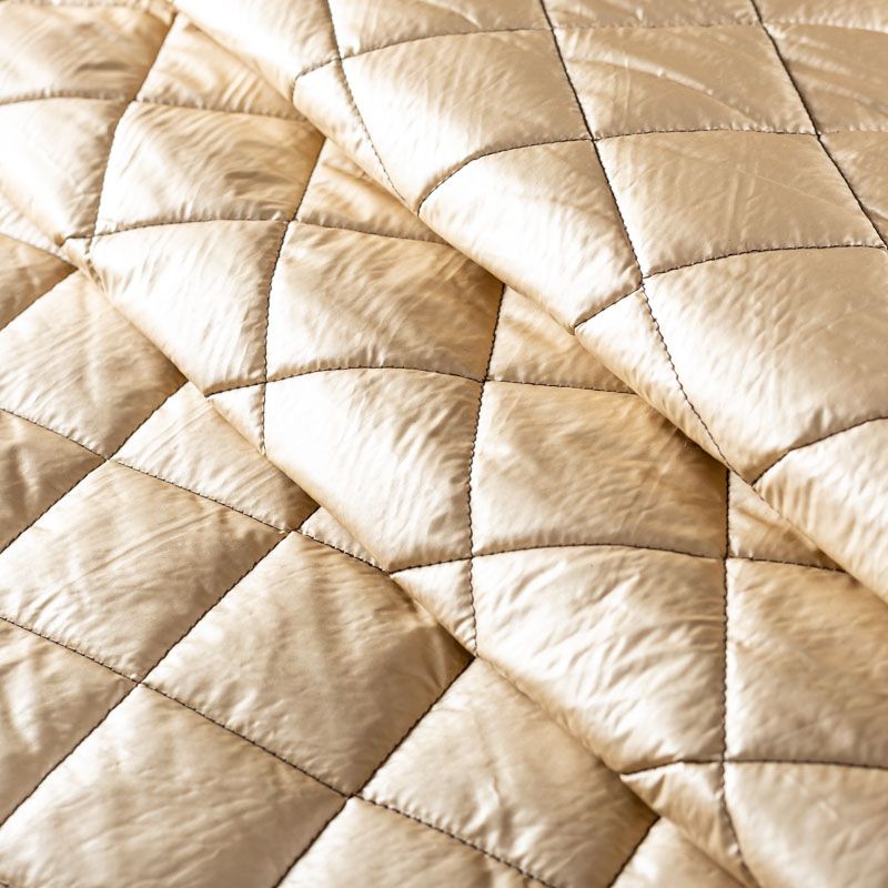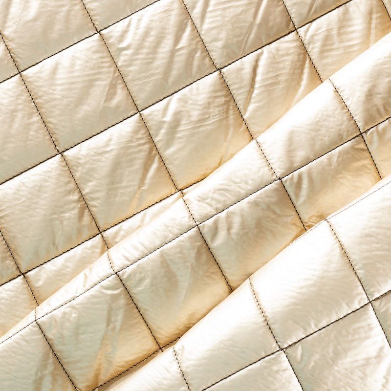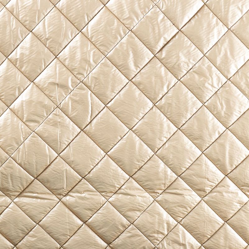 Трехслойная итальянская курточная ткань золотисто-бежевого оттенка с легким эффектом металлик, простеганная не крупными ромбами размером 3х3 см. Нижний, черного цвета, заменяет подклад и верхний слой - полиэстер, по качеству напоминает болонь, между ними синтепон. Ткань легкая, пластичная, хорошо драпируется. Прекрасно подойдет для  пошива легких пальто, курток, бомберов, жилетов, накидок-кейпов, объемных сумок, одежды для домашних питомцев, туристического снаряжения.
