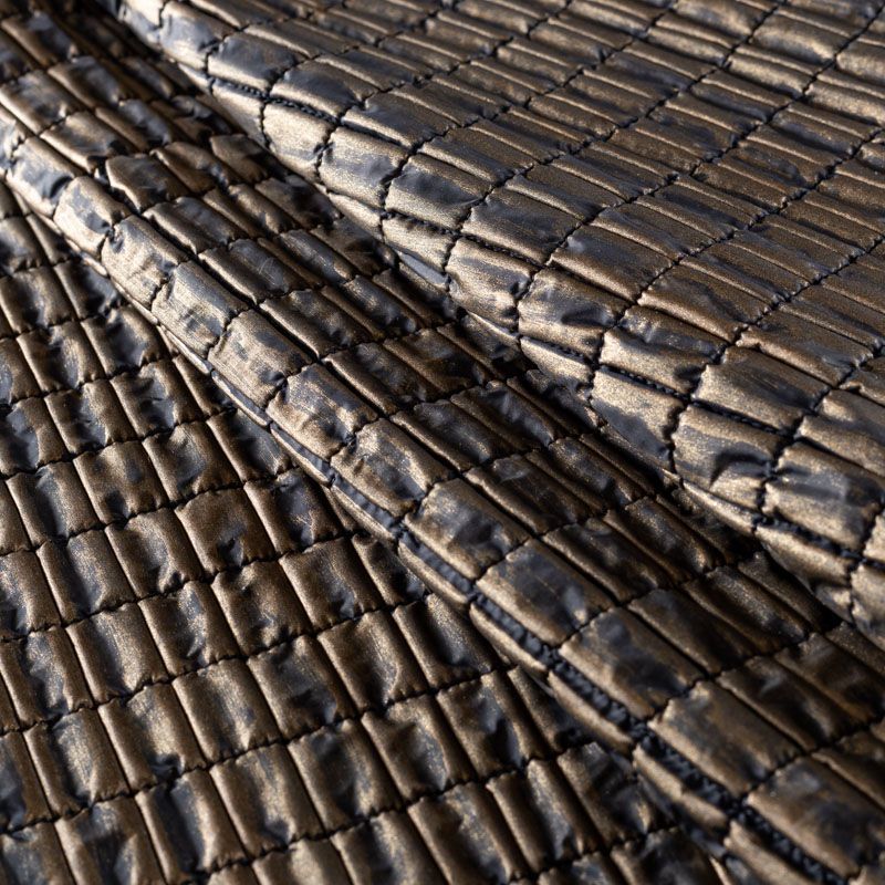 Оригинальная трехслойная итальянская курточная ткань бронзового оттенка с эффектом жатки, простеганная не крупными прямоугольниками. Нижний, черного цвета, заменяет подклад и верхний слой - полиэстер, по качеству напоминает болонь, а по фактуре кожу рептилии, между ними синтепон. Ткань легкая, пластичная, хорошо держит форму, отлично тянется по долевой, набирается на изделие объемом.  Прекрасно подойдет для  пошива легких пальто, курток, бомберов, жилетов, накидок-кейпов, объемных сумок, одежды для домашних питомцев, туристического снаряжения.