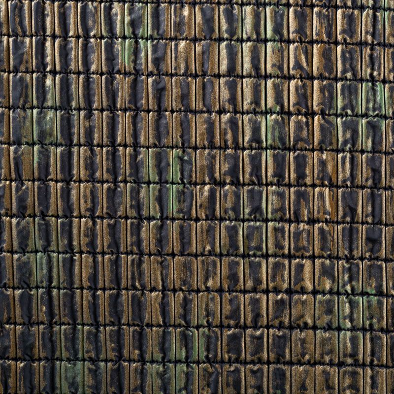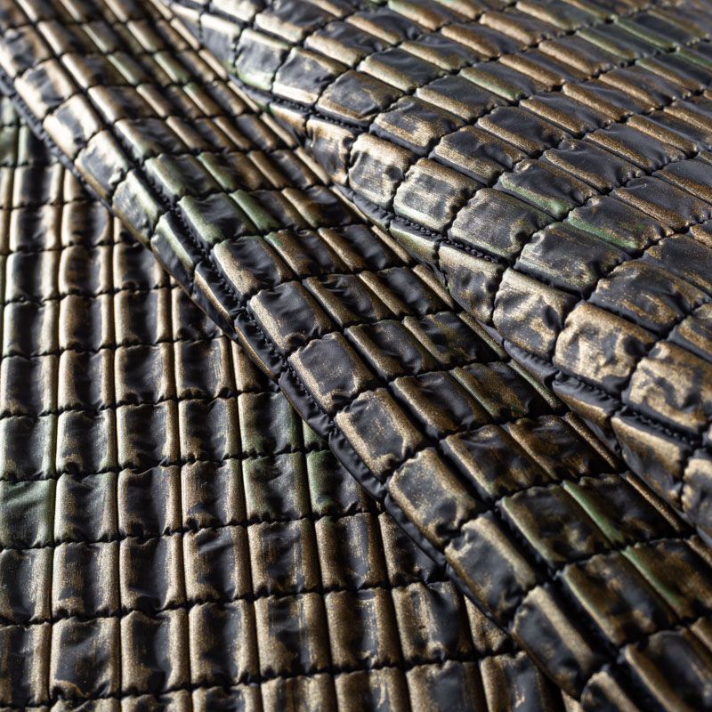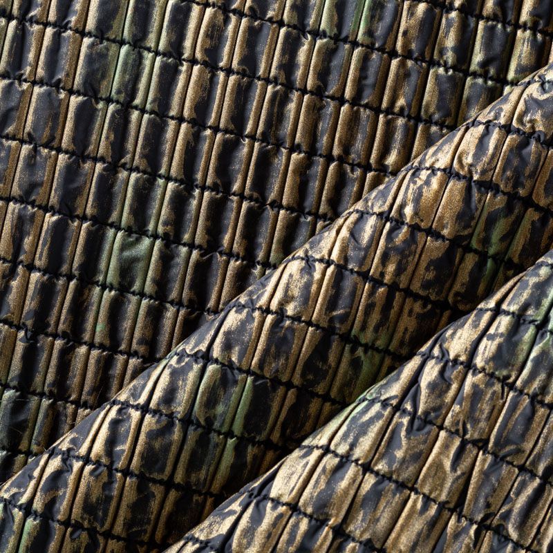 Оригинальная трехслойная итальянская курточная ткань состаренного золотистого оттенка с эффектом жатки, простеганная не крупными прямоугольниками. Нижний, черного цвета, заменяет подклад и верхний слой - полиэстер, по качеству напоминает болонь, а по фактуре кожу рептилии, между ними синтепон. Ткань легкая, пластичная, хорошо держит форму, отлично тянется по долевой, набирается на изделие объемом.  Прекрасно подойдет для  пошива легких пальто, курток, бомберов, жилетов, накидок-кейпов, объемных сумок, одежды для домашних питомцев, туристического снаряжения.