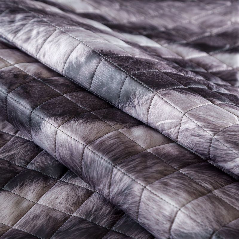 Трехслойная итальянская курточная ткань серого оттенка с принтом, имитирующим длиноворсый мех, простеганная не крупными ромбами. Нижний, черного цвета, заменяет подклад и верхний слой - полиэстер, по качеству напоминает болонь, между ними синтепон. Ткань легкая, пластичная, хорошо драпируется. Прекрасно подойдет для пошива легких пальто, курток, бомберов, жилетов, накидок-кейпов, объемных сумок, одежды для домашних питомцев, туристического снаряжения.