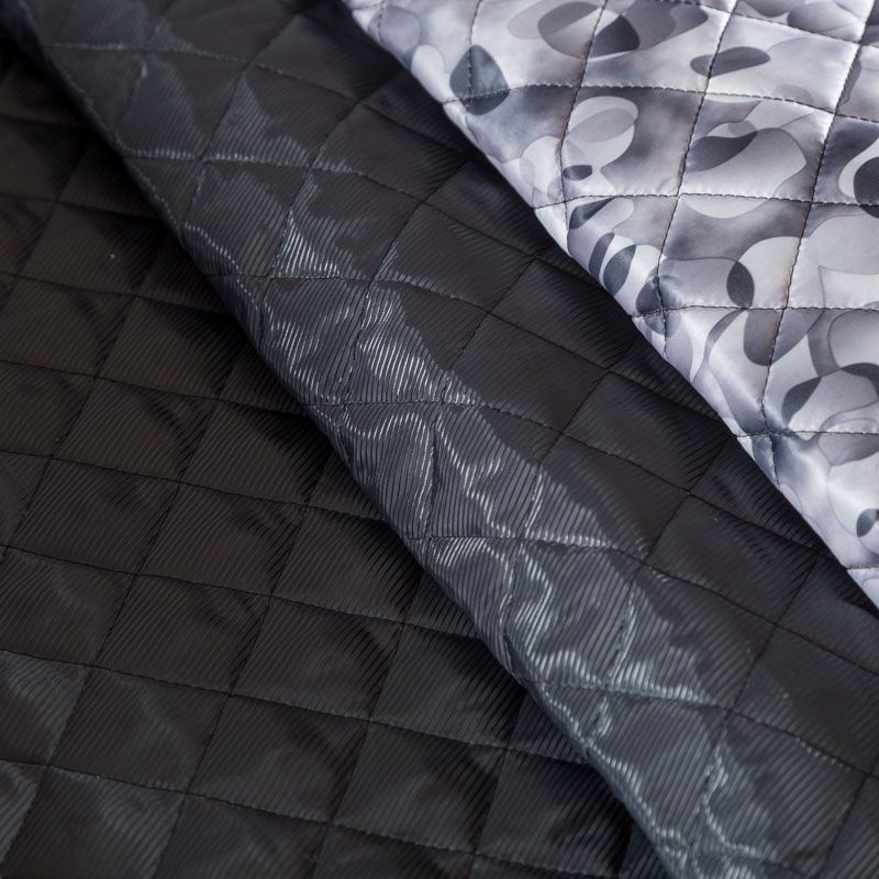Трехслойная итальянская курточная ткань серого оттенка с абстрактным принтом, простеганная не крупными ромбами. Нижний, черного цвета, заменяет подклад и верхний слой - полиэстер, по качеству напоминает болонь, между ними синтепон. Ткань легкая, пластичная, хорошо драпируется. Прекрасно подойдет для пошива легких пальто, курток, бомберов, жилетов, накидок-кейпов, объемных сумок, одежды для домашних питомцев, туристического снаряжения.