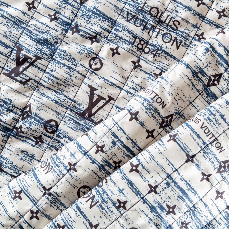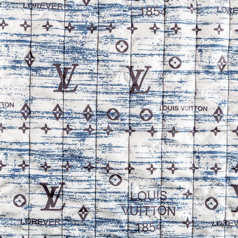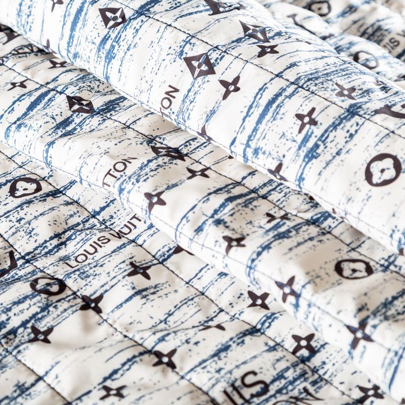 Итальянская двухслойная курточная стежка сливочного цвета с  принтом лого известного бренда, простеганная вертикальными линиями вдоль кромки. Нижний слой - синтепон, верхний - полиэстер, по качеству напоминает болонь. Очень мягкая и легкая, пластичная, хорошо драпируется. Прекрасно подойдет для  пошива легких пальто, курток, жилетов, накидок-кейпов, комбинезонов, объемных сумок, одежды для домашних питомцев, туристического снаряжения.