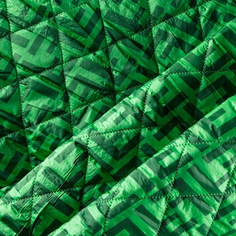 Двухслойная курточная стежка ярко-зеленого оттенка с принтом лого известного бренда, простеганная не крупными ромбами. Нижний слой - синтепон, верхний - полиэстер, по качеству напоминает болонь. Очень мягкая и легкая, пластичная, хорошо драпируется. Прекрасно подойдет для  пошива легких пальто, курток, жилетов, накидок-кейпов, комбинезонов, объемных сумок, одежды для домашних питомцев, туристического снаряжения.