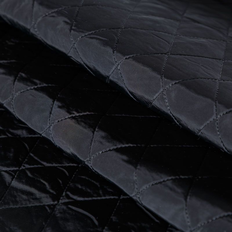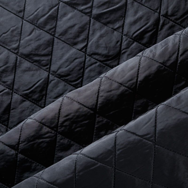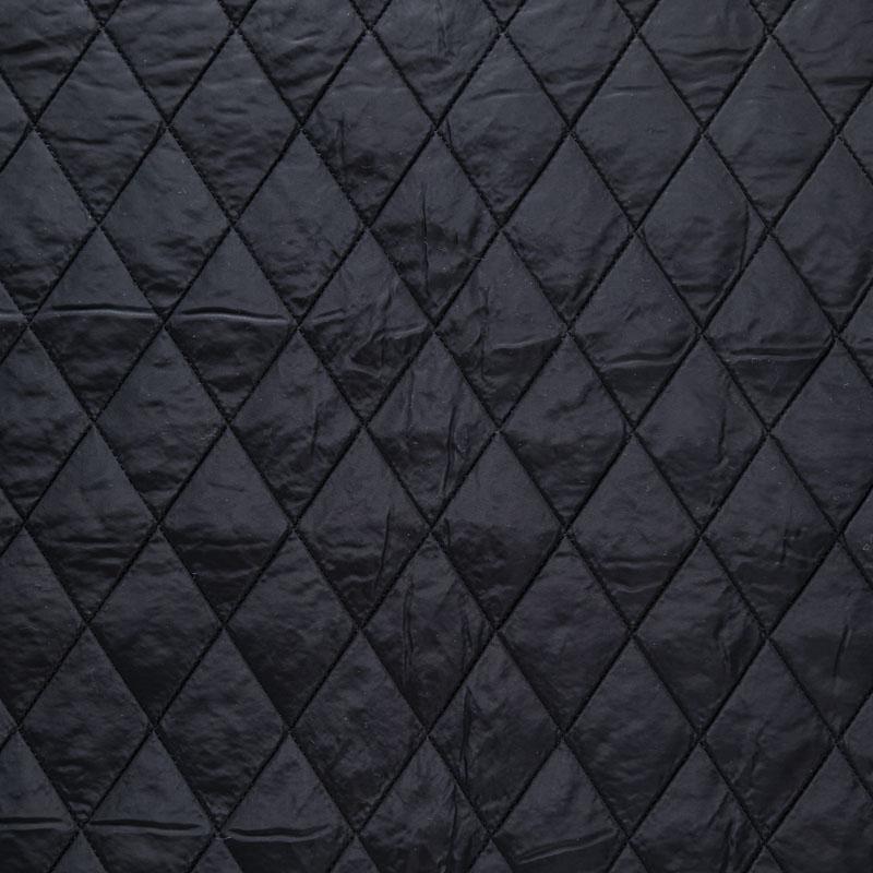 Двухслойная курточная ткань черного цвета, простеганная не крупными ромбами. Нижний слой - синтепон, верхний - матовый полиэстер с жатым эффектом. Очень мягкая и легкая, пластичная, хорошо драпируется. Прекрасно подойдет для  пошива легких пальто, курток, жилетов, накидок-кейпов, объемных сумок.