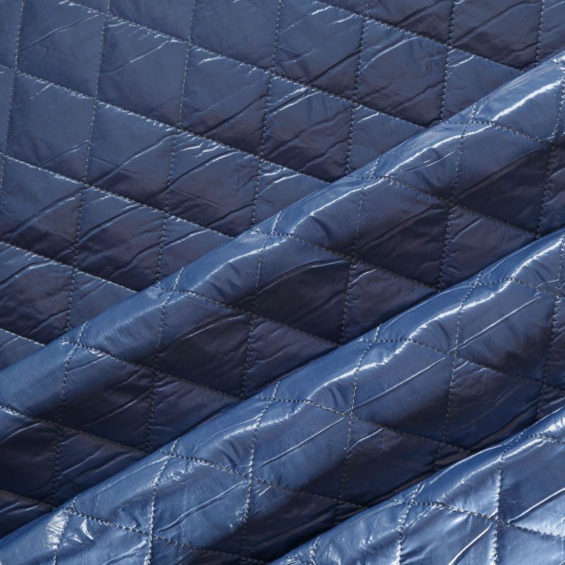 Трехслойная курточная ткань голубого оттенка, простеганная не крупными ромбами. Нижний слой - матовый фактурный полиэстер, средний - тонкий синтепон, верхний - глянцевая гладкая плащевка. Очень мягкая и легкая, пластичная, хорошо драпируется. Прекрасно подойдет для  пошива легких пальто, бомберов, парки, курток, жилетов, накидок-кейпов, объемных сумок.
