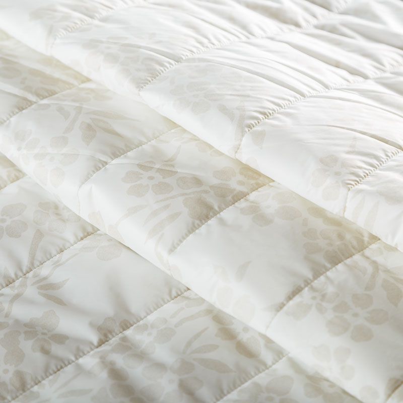 Итальяская двухслойная курточная ткань молочного оттенка, простеганная широкими полосами вдоль кромки. Нижний слой - воздушный синтепоновый утеплитель, верхний - матовая плащевая ткань со стилизованным растительным принтом песочного оттенка. Очень мягкая и легкая, пластичная, хорошо драпируется. Прекрасно подойдет для  пошива легких пальто, бомберов, парки, курток, жилетов, накидок-кейпов, объемных сумок.