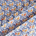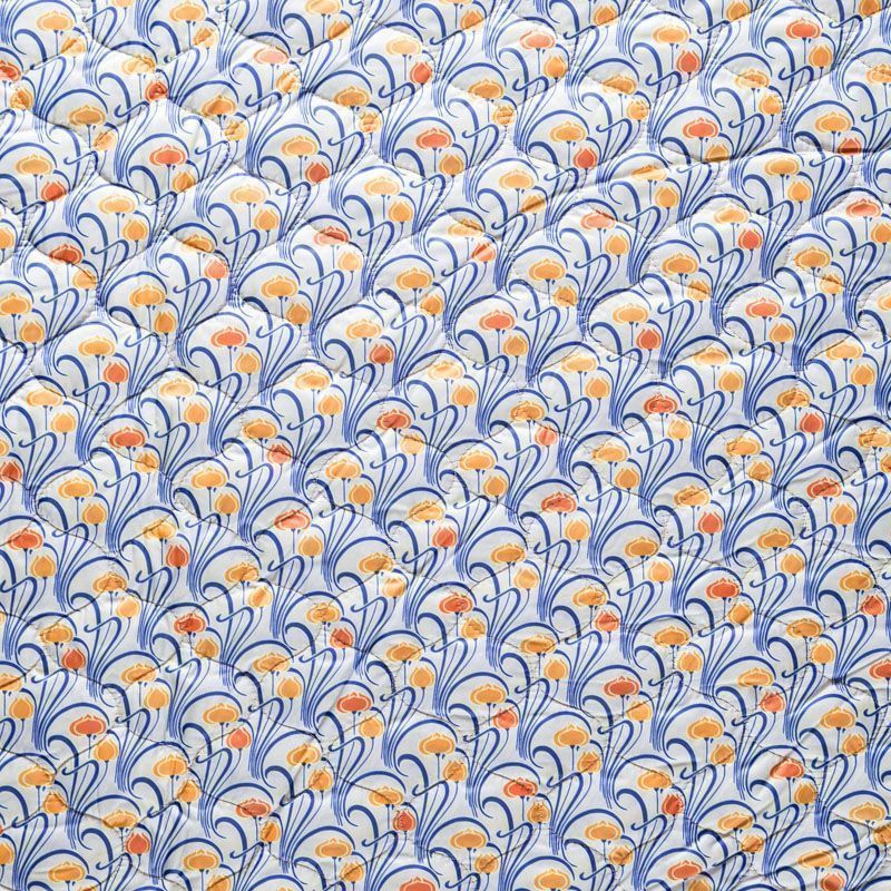 Трехслойная итальянская курточная ткань светлого оттенка со стилизованным узором в желто-синих цветах, простеганная фигурными линиями. Нижний слой синего цвета, средний слой - синтепон, верхний слой - принтованный матовый полиэстер. Ткань легкая, пластичная, хорошо драпируется. Прекрасно подойдет для  пошива легких пальто, курток, бомберов, жилетов, накидок-кейпов, объемных сумок, одежды для домашних питомцев, туристического снаряжения.