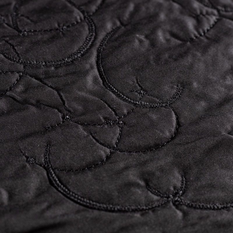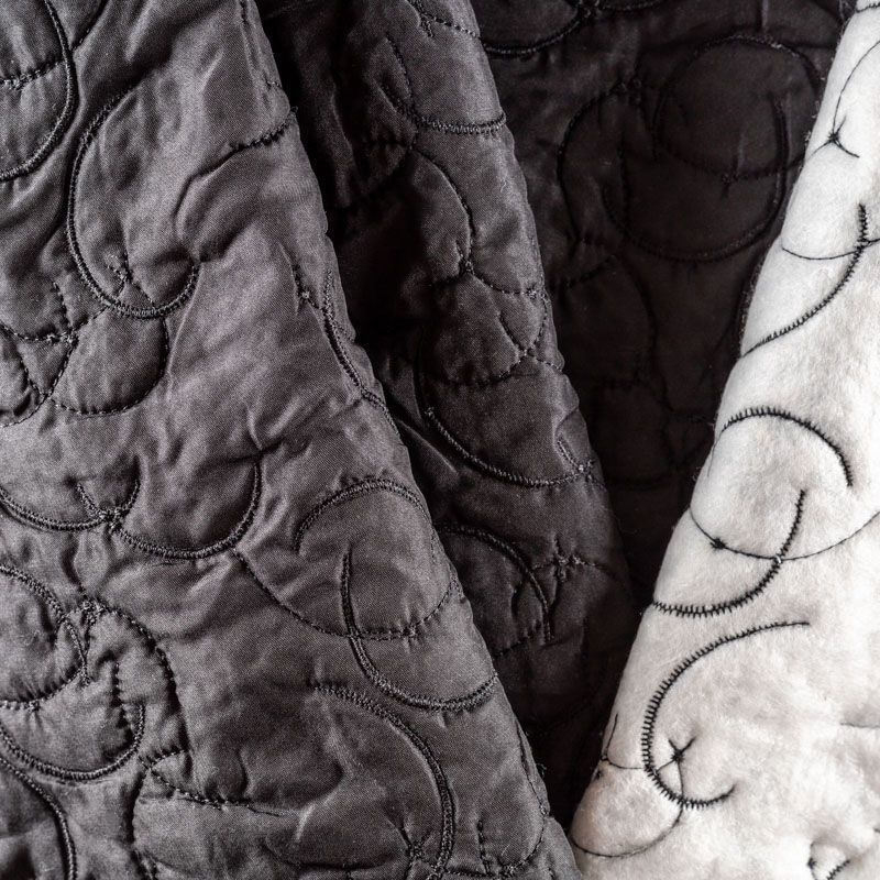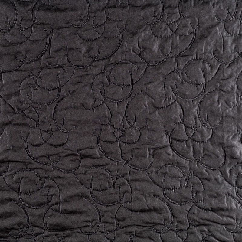 Двухслойная курточная ткань церного цвета, простеганная в виде абстрактного рисунка нитками в тон. Нижний слой - синтепон, верхний - полиэстер, по качеству напоминает болонь. Очень мягкая и легкая, пластичная, хорошо драпируется. Прекрасно подойдет для  пошива легких пальто, курток, жилетов, накидок-кейпов, объемных сумок, а также в качестве подклада-утеплителя для верхней одежды.