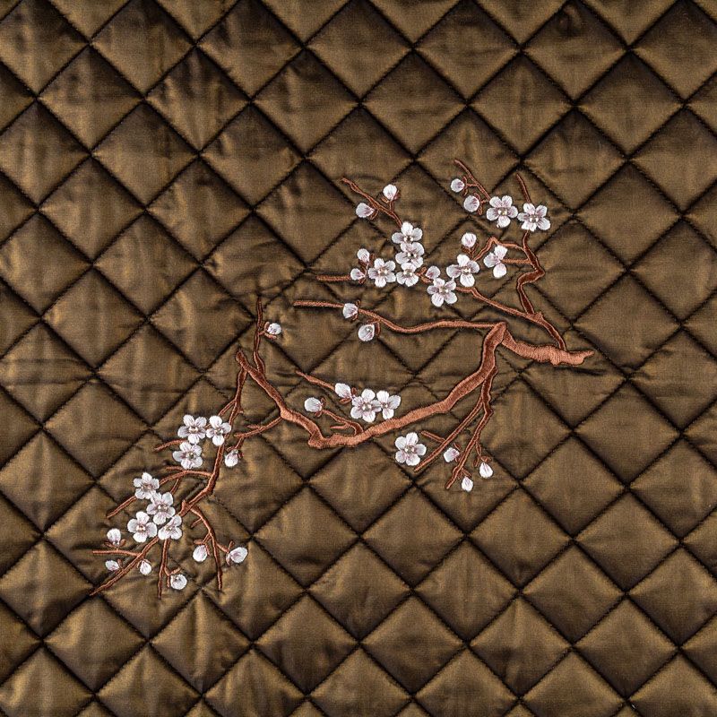 Курточный купон на синтепоне и подкладке, простеганный не крупными ромбами размером 3,5х3,5 см. С лицевой стороны тонкая, но прочная плащевая ткань с вышивкой в виде цветущей ветки сакуры, с изнаночной - желто-бежевая ткань с полоску. Материал мягкий, объемный и "воздушный", хорошо держит форму и подойдет для пошива легких пальто, курток, жилетов, накидок-кейпов, парки.