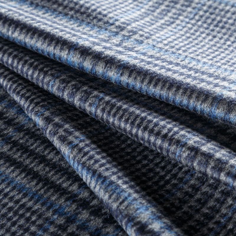 Итальянский плотный пальтовый кашемир темно-серого оттенка. Сочетание линий черного и синего цвета образуют эффектую клетку. Ткань великолепно держит форму, имеет мягкий направленный ворс, поверхность мягкая, шелковистая и приятная на ощупь. Идеально подойдет для пальто прямого кроя, кокона, бомбера, куртки, жилета.