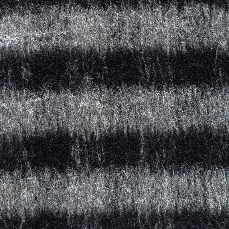 Итальянская шерсть с добавлением мохера в горизонтальную серо-черную полоску. Полотно с густым направленным ворсом, среднем плотности, пластичное, мягкое, приятное на ощупь. Подойдет для пошива пальто, кардигана, бомбера, пончо.