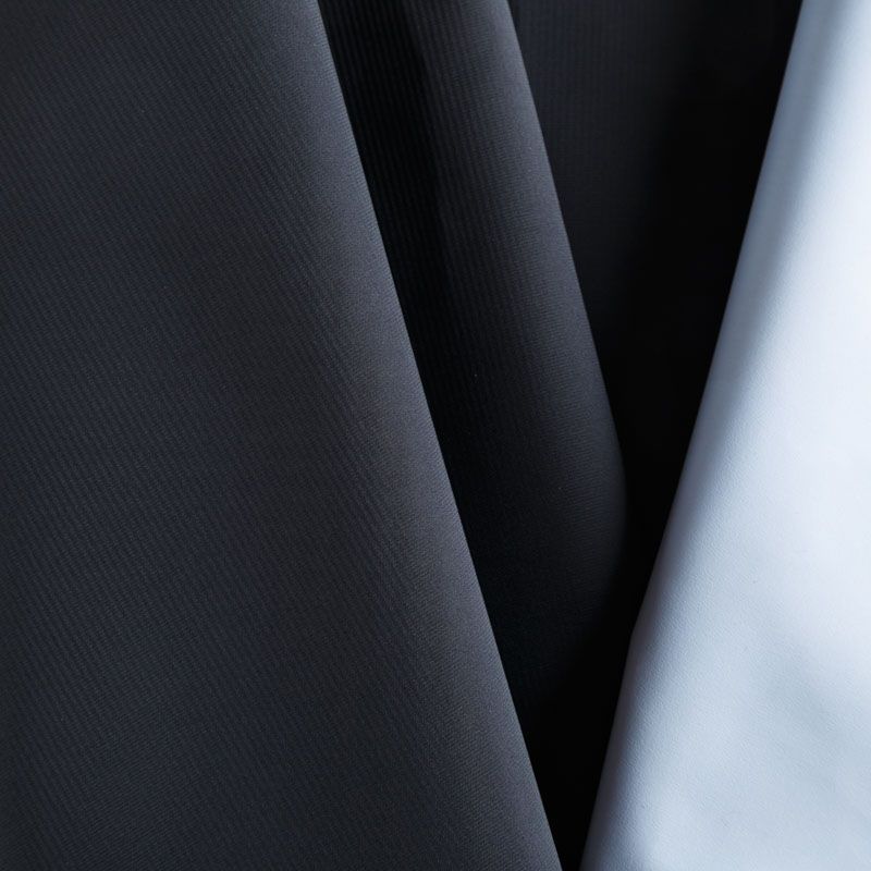 Плотная прочная плащевая ткань черного цвета с полиуретановым белым покрытием с изнаночной стороны. Поверхность ткани матовая, шероховатая на ощупь, слегка рельефная. Подходит для изготовления плащей, курток, ветровок, бомберов, одежды для домашних питомцев, туристического снаряжения.