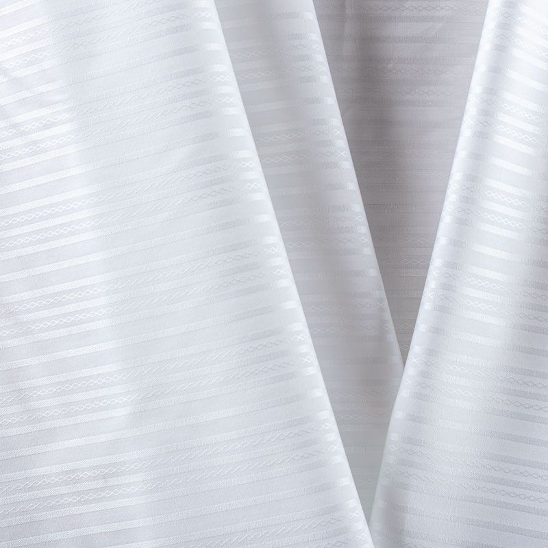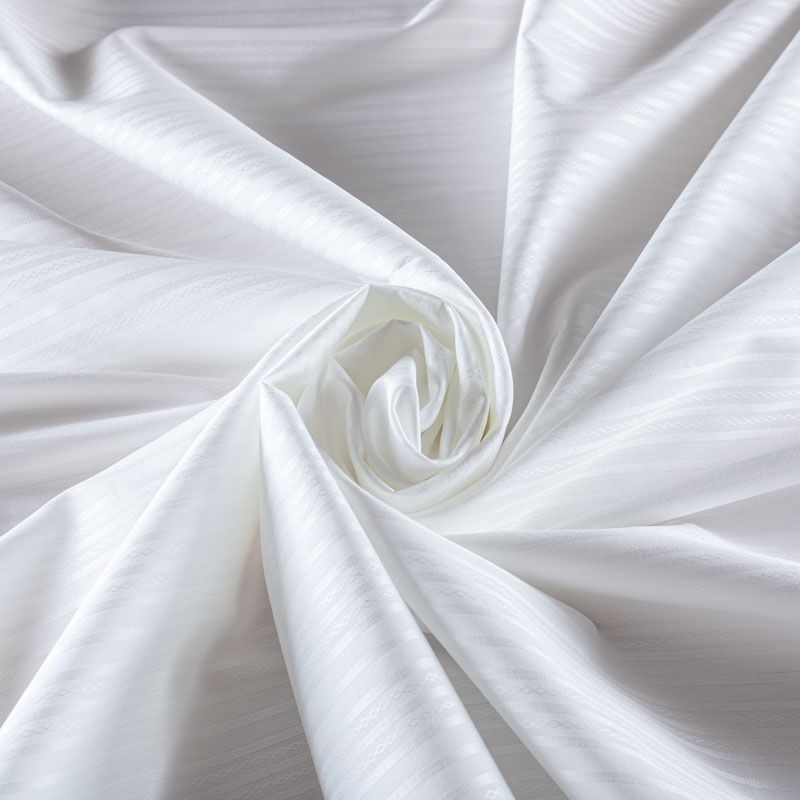 Белоснежная итальянская плательно-сорочечная вискоза с жаккардовыми полосками. Ткань мягкая, тонкая, лёгкая, непрозрачная, пластичная и приятная к телу, хорошо драпируется, имеет фактурную поверхность, сатиновый блеск. Прекрасно подойдет как для пошива предметов мужского гардероба, так и для блуз, платья-рубашки, сарафана, туники, топа, летнего костюма.