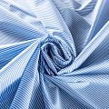 Итальянский плательно-рубашечный хлопок в частую узкую полоску светло-голубого оттенка. Ткань мягкая, лёгкая, непрозрачная, пластичная и приятная к телу, хорошо драпируется, имеет гладкую матовую поверхность и сатиновое плетение. Прекрасно подойдет как для пошива платья-рубашки, сарафана, платьев различных фасонов, туники, топа, летнего костюма, комбинезона.