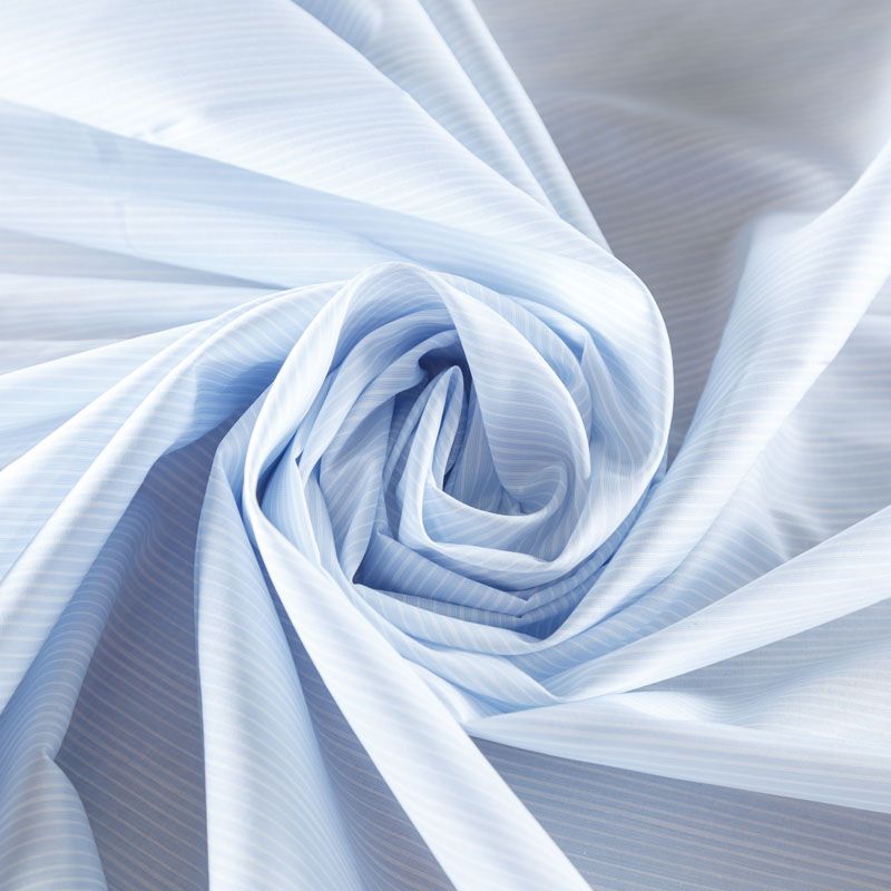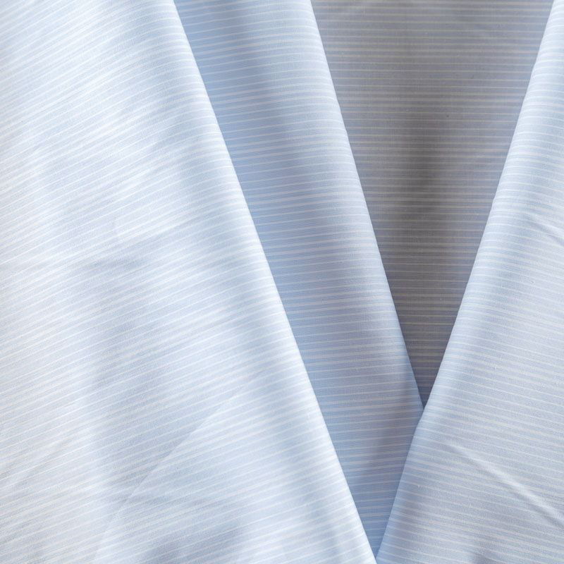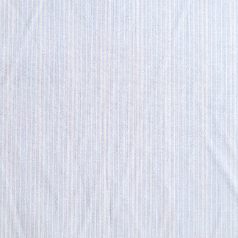 Итальянский плательно-рубашечный хлопок голубого оттенка в тонкую белую полоску. Ткань мягкая, лёгкая, слегка прозрачная, пластичная и приятная к телу, хорошо драпируется, имеет гладкую матовую поверхность и сатиновое плетение. Прекрасно подойдет как для пошива платья-рубашки, сарафана, платьев различных фасонов, туники, топа, летнего костюма, комбинезона, детской и мужской одежды.