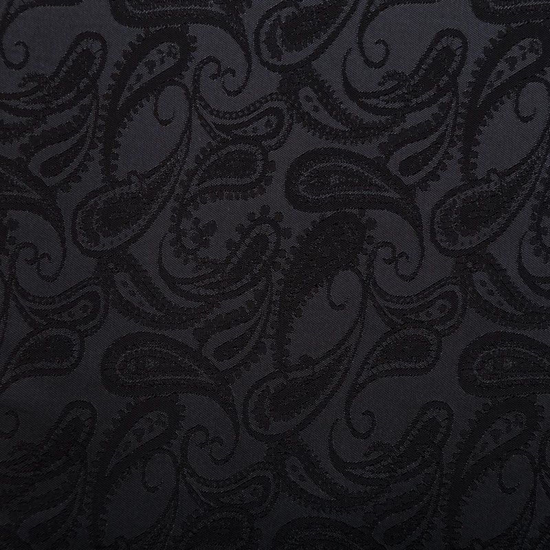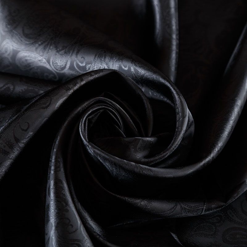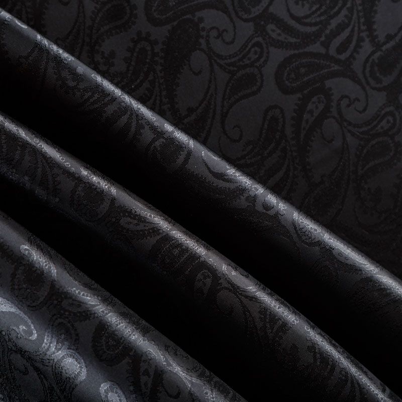 Итальянская подкладочная ткань из вискозы черного оттенка с жаккардовым узором пейсли и красивым лоском. Полотно средней плотности, легкое, не просвечивает, хорошо скользит, не тянется. Подойдет для изготовления таких изделий, как пальто, костюмы, куртка, шуба, платье, жакет.