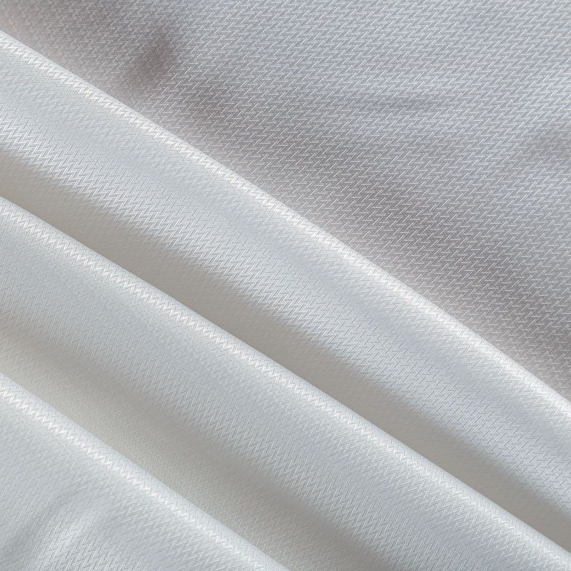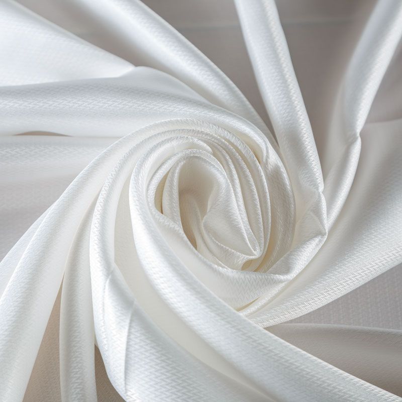 Смесовая подкладочная ткань молочного оттенка с жаккардовым геометрическим узором и красивым лоском. Полотно средней плотности, легкое, не просвечивает, хорошо скользит, не тянется. Подойдет для изготовления таких изделий, как пальто, костюмы, куртка, шуба, платье, жакет.