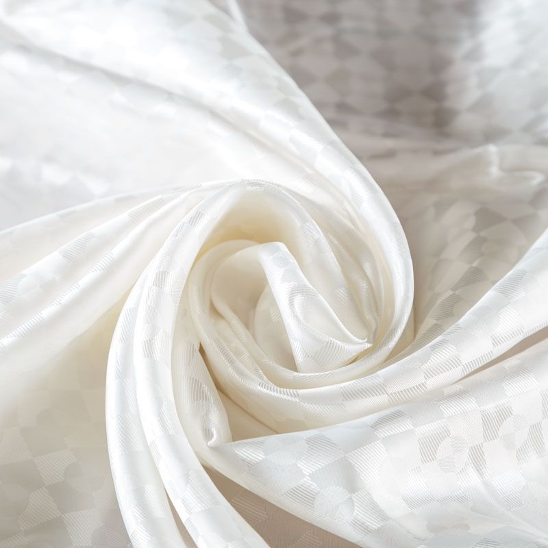 Смесовая подкладочная ткань белого оттенка с жаккардовым геометрическим узором и красивым лоском. Полотно средней плотности, легкое, не просвечивает, хорошо скользит, не тянется. Подойдет для изготовления таких изделий, как пальто, костюмы, куртка, шуба, платье, жакет.