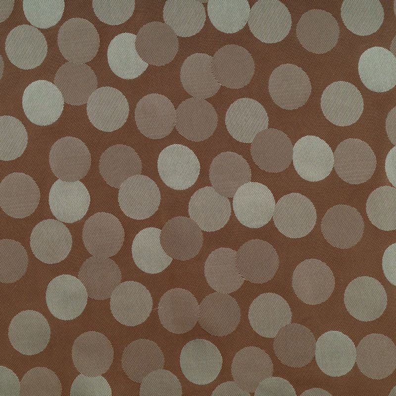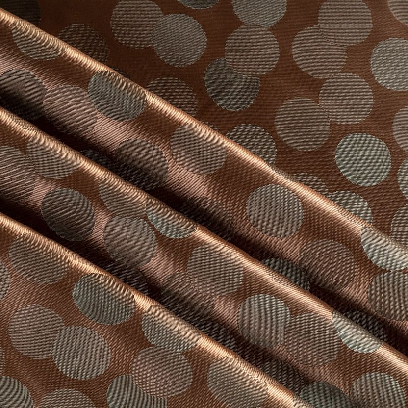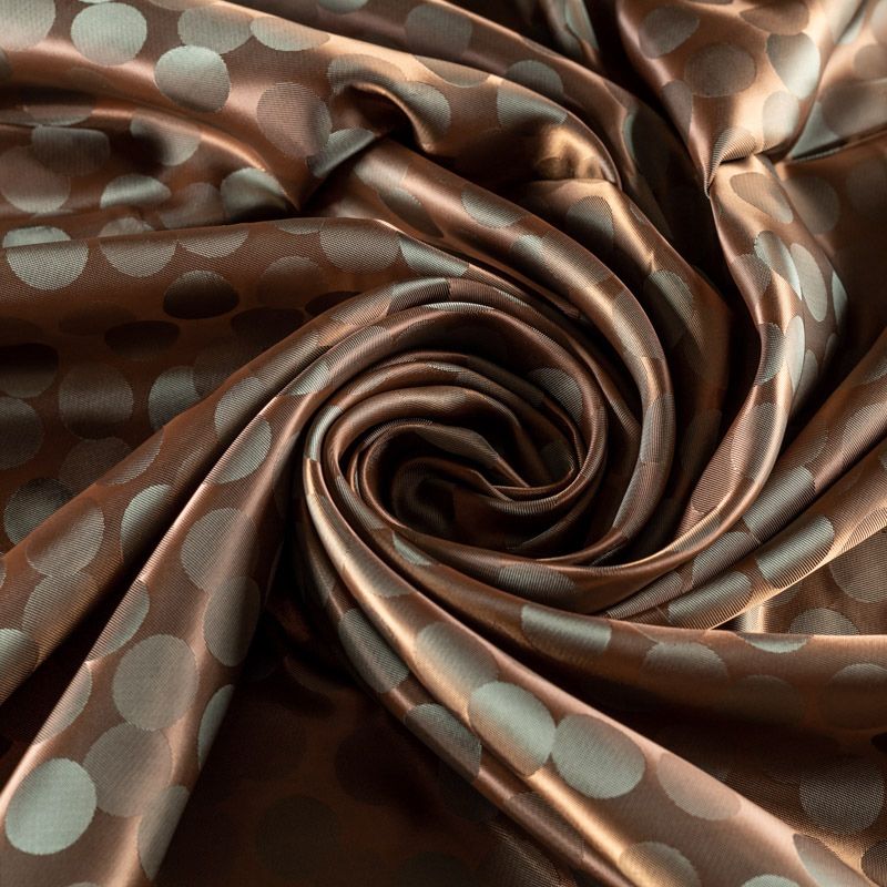 Подкладочная ткань легкая, с жаккардовым крупным "горохом",  оттенка бронзы, с красивым блеском. Не  просвечивает, хорошо скользит. Подойдет для изготовления таких изделий, как пальто, костюмы, куртка, шуба, платье, жакет.