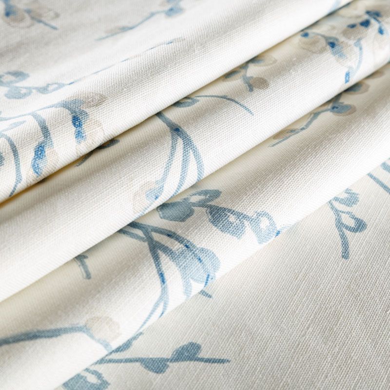 Хлопковая портьерная ткань с изящным весенним принтом в голубых оттенках на молочном теплом фоне. Ткань средней плотности, без блеска, хорошо драпируется, имеет полонтяное переплетение. Можно использовать для пошива портьер, римской шторы, салфеток, столового белья, подушек, покрывал и других предметов текстильного интерьера.