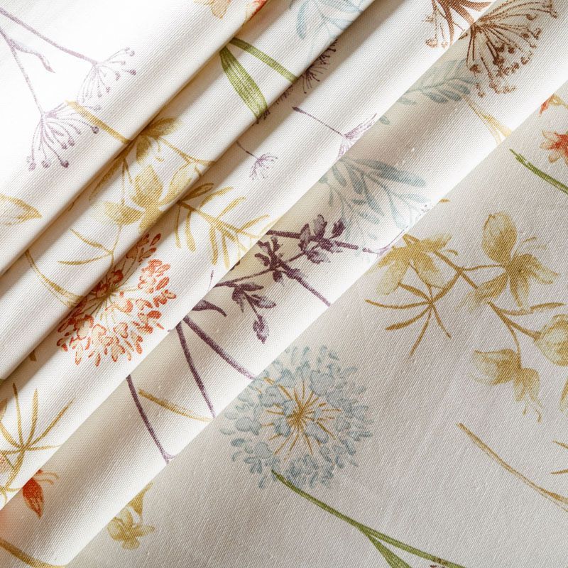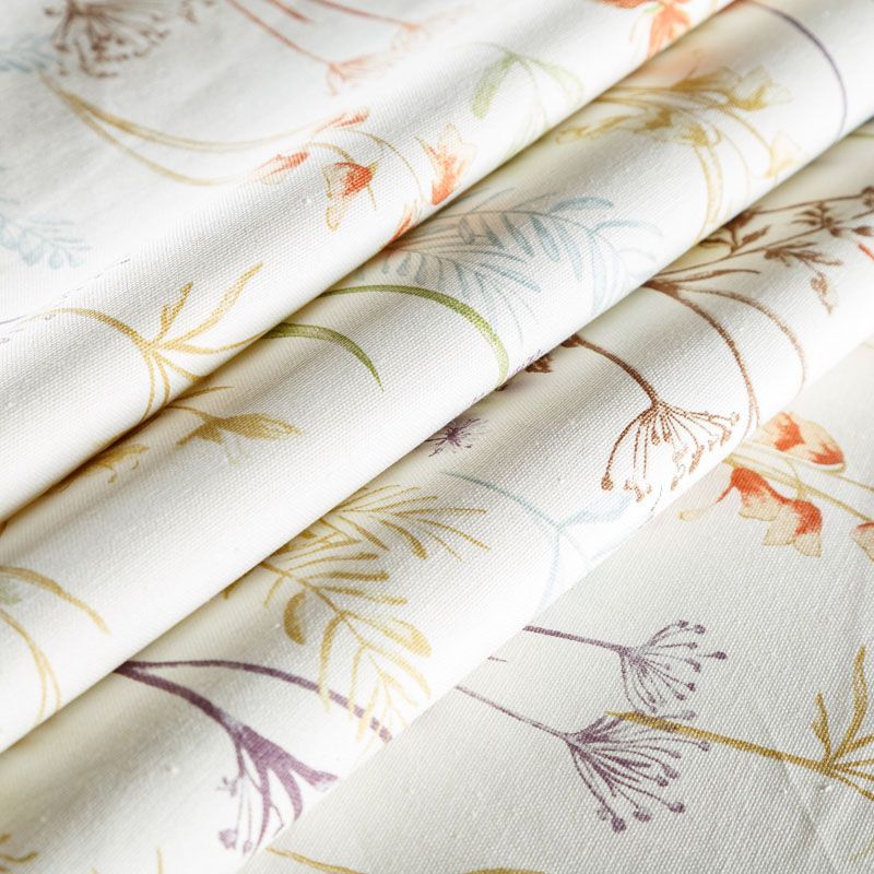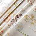 Натуральная хлопковая портьерная ткань с принтом полевых растений в пастельных нежных оттенках. Ткань средней плотности, без блеска, хорошо драпируется, имеет полонтяное переплетение. Прекрасно подойдет для оформления детской, кухни, столовой или дачного интерьера. Можно использовать для пошива портьер, римской шторы, салфеток, столового белья, подушек, покрывал и других предсетов текстильного интерьера.