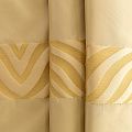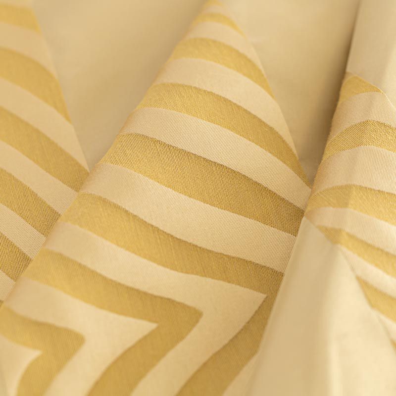 По своей структуре шелковые портьерные ткани являются мягким и красивым материалом, способным отражать свет. Изделия из шелка удивительно переливаются и блестят, придавая интерьеру помещения особую атмосферу и вид. Такие портьерные ткани лучше всего применять для создания покрывал, наволочек, штор, легких, воздушных и светлых – они отлично подойдут для затемненных мест либо закрытых окон. Ткань имеет вертикальные полосы в разных оттенках золотисто-бежевого цвета, а так же сочетает в себе чередование полос матовой и блестящей текстур.