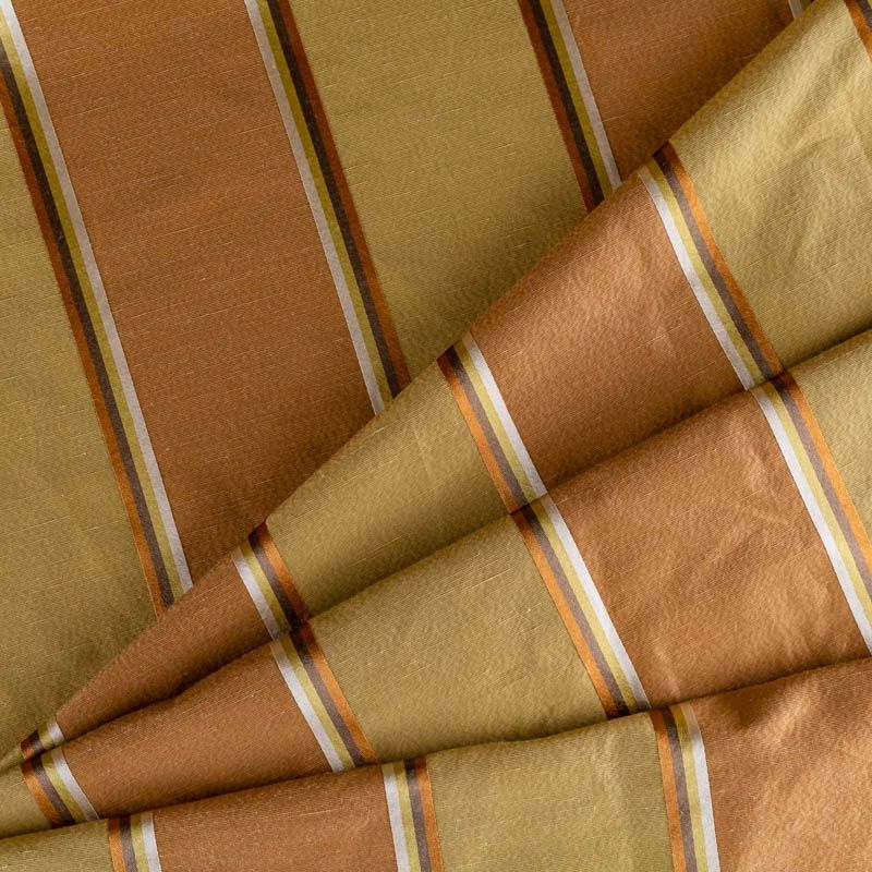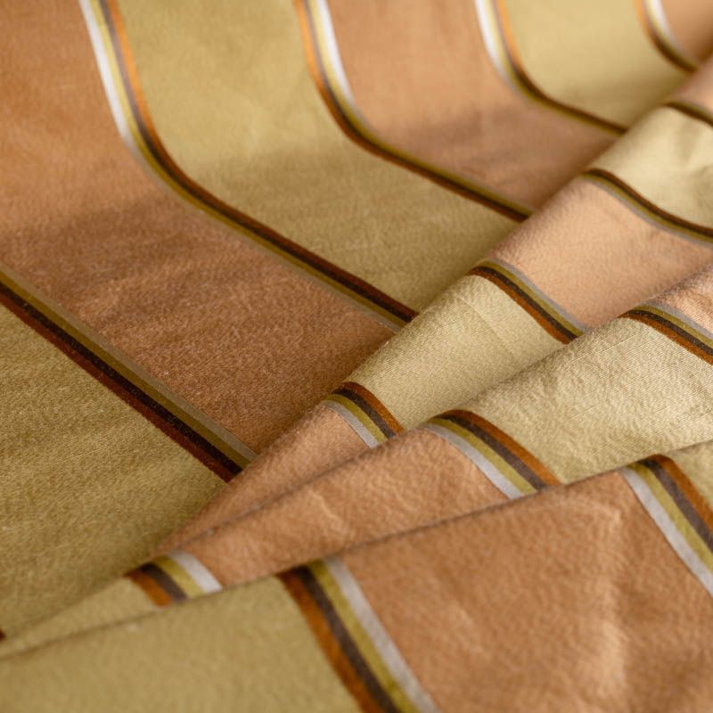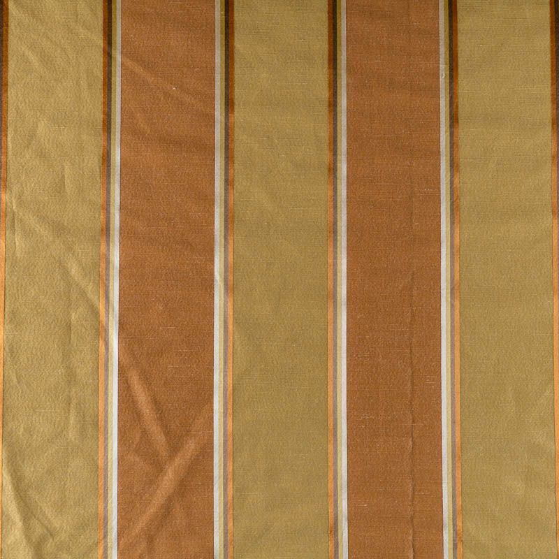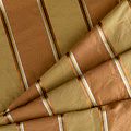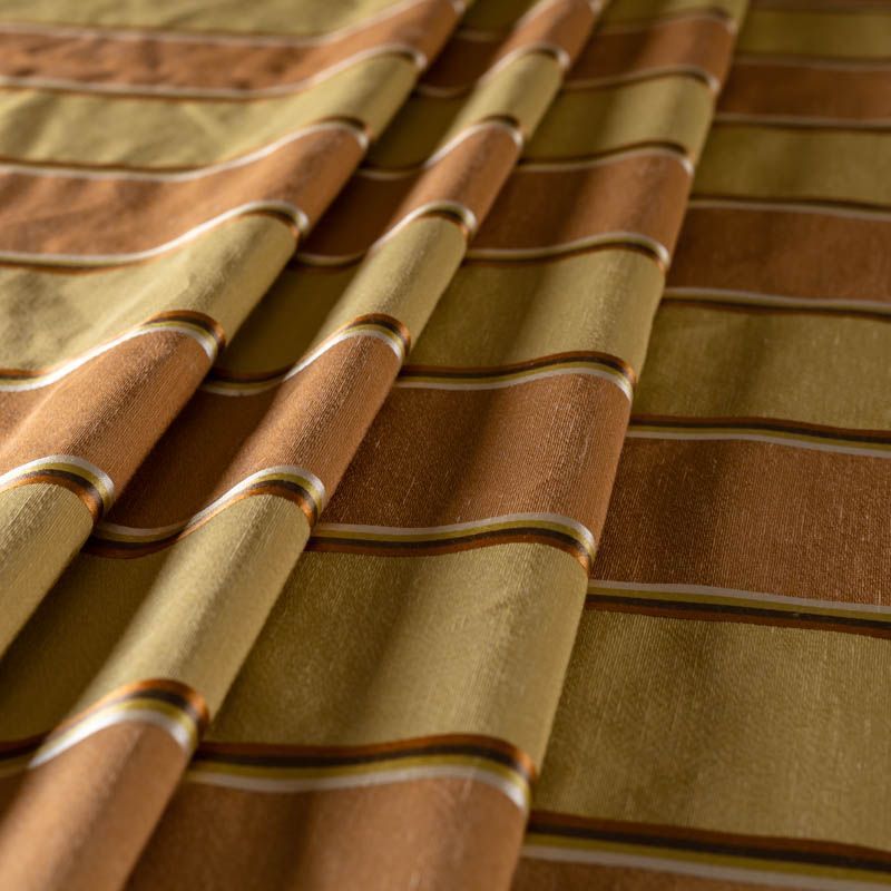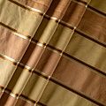 По своей структуре шелковые портьерные ткани являются мягким и красивым материалом, способным отражать свет. Изделия из шелка удивительно переливаются и блестят, придавая интерьеру помещения особую атмосферу и вид. Такие портьерные ткани лучше всего применять для создания покрывал, наволочек, штор, легких, воздушных и светлых. Ткань имеет вертикальные полосы в разных оттенках золотистого цвета, а так же сочетает в себе чередование полос матовой и блестящей текстур.