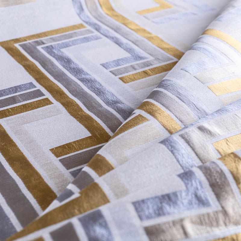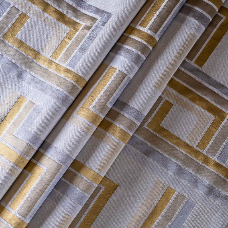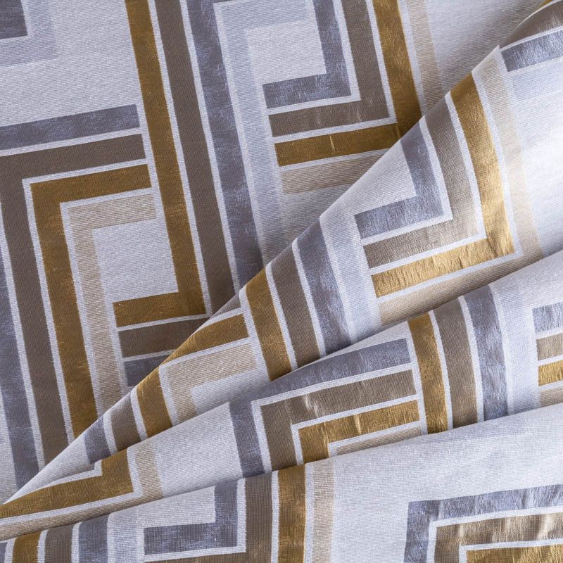 Итальянская жаккардовая фактурная портьерная ткань в благородной золотисто-серой цветовой гамме с геометрическим рисунком. Вискоза с хлопком создают тяжелые складки при драпировке. Подходит для пошива штор, ламбрекенов, покрывал, наволочек, чехлов на мебель и других элементов декора.