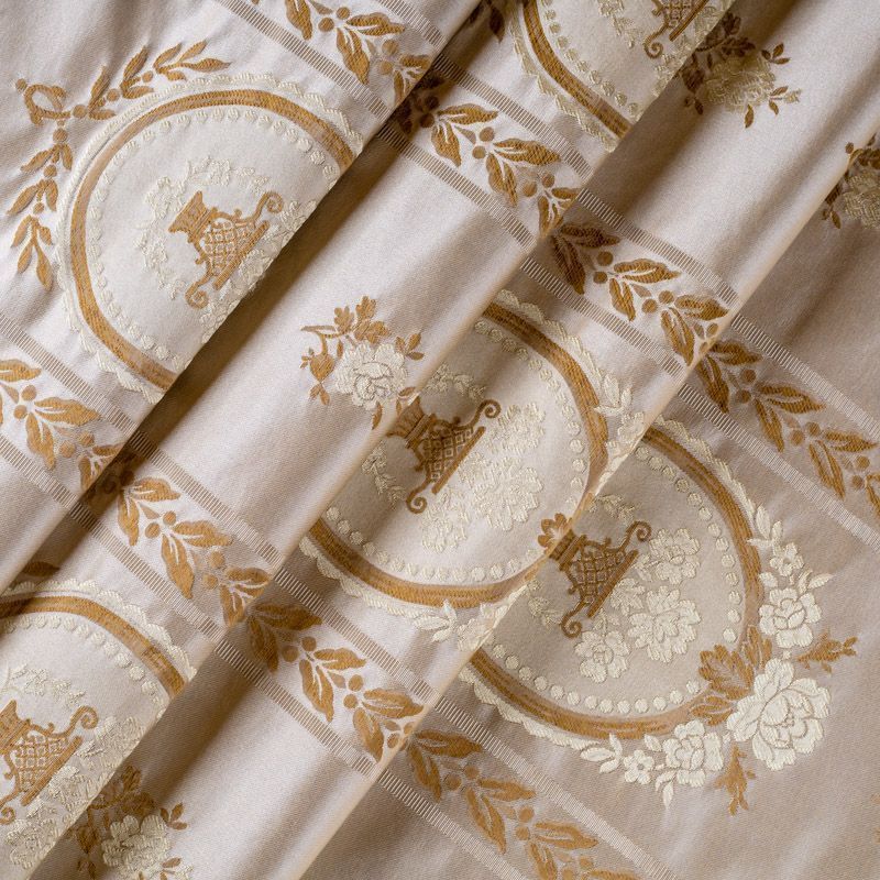 Эксклюзивная, роскошная и яркая по исполнению ткань с жаккардовым плетением - имитацией вышивки, из которой можно сшить изящные шторы для классических интерьеров, покрывала, наволочки и другие элементы декора. В основе дизайна – традиционные греческий узоры, растительный орнамент и амфоры.