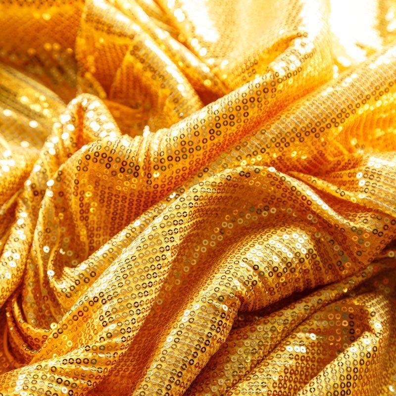 Блестящие пайетки в золотом цвете. Мелкие, размером около 2 мм. Основа - "холодное" тонкое трикотажное полотно, комфортное в носке. Ткань не прозрачная, тянется. Подойдет для вечернего, коктельного платья или юбки, комбинезона, топа, танцевальных и сценических костюмов.