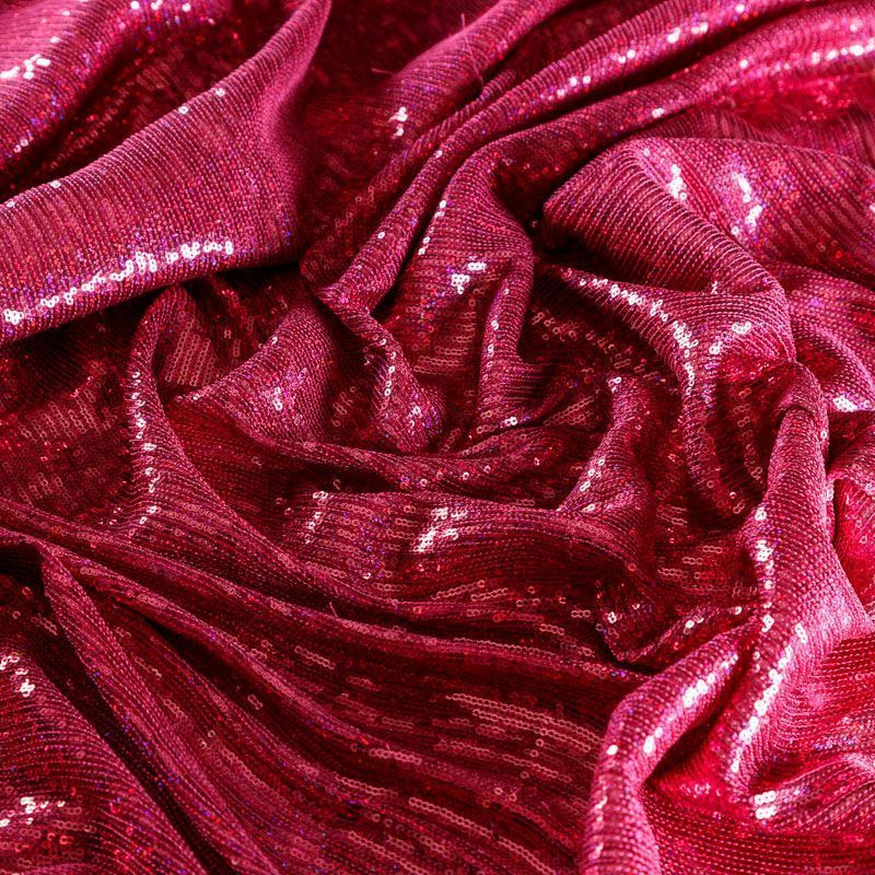 Эластичная сетка малинового оттенка по всей поверхности которой расположены глянцевые пайетки. Ткань очень хорошо драпируется, красиво переливается, имеет глянцевый блеск, пластичная, полоски расположены вдоль кромок, которые обработаны вышитым фигурным фестоном, набирается объемом,  Пайетки — идеальный материал для праздников и вечеринок. Из них получится эффектное платье, жакет, боди, туника, юбка или комбинезон.