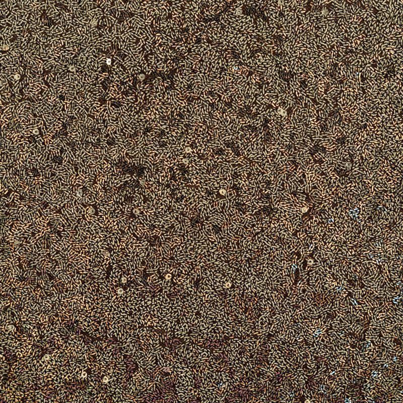 Мелкие пайетки бронзового оттенка на плотной сетчатой основе. Ткань хорошо драпируется, красиво переливается, имеет глянцевый блеск. Немного тянется, благодаря чему изделия получаются комфортными и отлично сидят по фигуре. Пайетки — идеальный материал для праздников и вечеринок. Из них получится эффектное платье, туника, юбка или комбинезон.