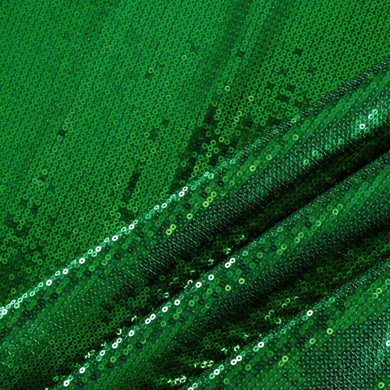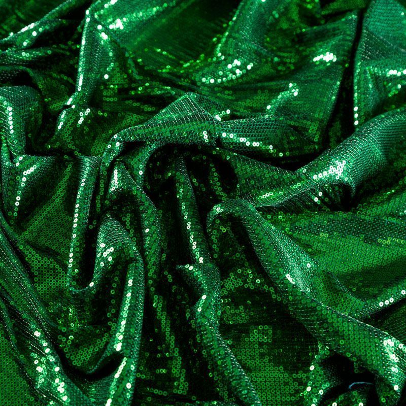 Блестящие пайетки сочного зеленого оттенка. Мелкие, размером около 3 мм. Основа - трикотажное полотно, комфортное в носке. Ткань не прозрачная, тянется.  Подойдет для вечернего коктельного платья или юбки, комбинезона, топа, танцевальных и сценических костюмов.