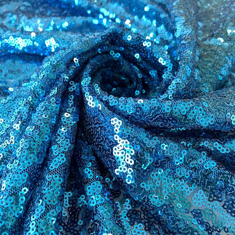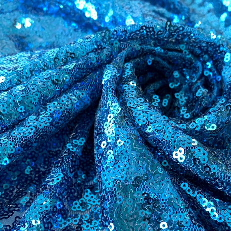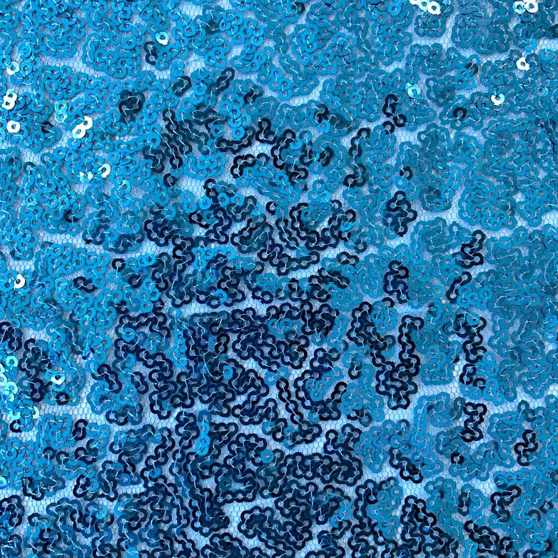 Блестящие пайетки ярко-голубого оттенка. Мелкие, размером около 3 мм, расположены в хаотичном порядке. Основа - мягкая и эластична сетка.  Ткань полупрозрачная, может потребоваться подклад. Подойдет для вечернего платья, юбки, нарядных детских изделий, танцевальных и сценических костюмов.
