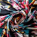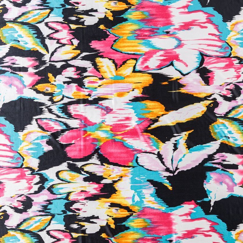 "Холодный" трикотаж средней плотности черного цвета с ярким принтом, хорошо тянется за счет эластана в составе. Ткань не сухая, мягкая, не просвечивает, хорошо драпируется. Отлично подойдет для пошива платья, туники, лонгслива, топа, юбки.