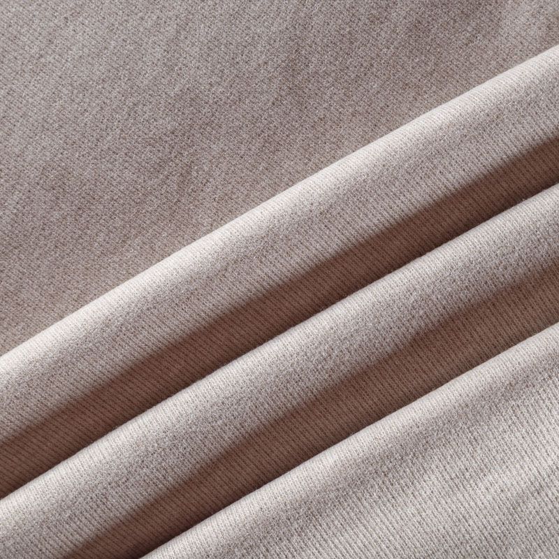 Вязаный трикотаж холодного бежевого оттенка средней плотности, упругий и прочный, держит форму, при этом хорошо тянется в поперечном направлении. Отлично подойдет для пошива легкой верхней одежды, жакета, кардигана, брючного костюма, юбки или платья.