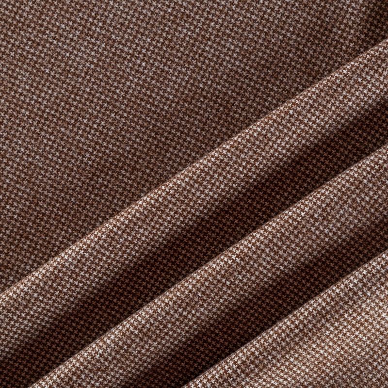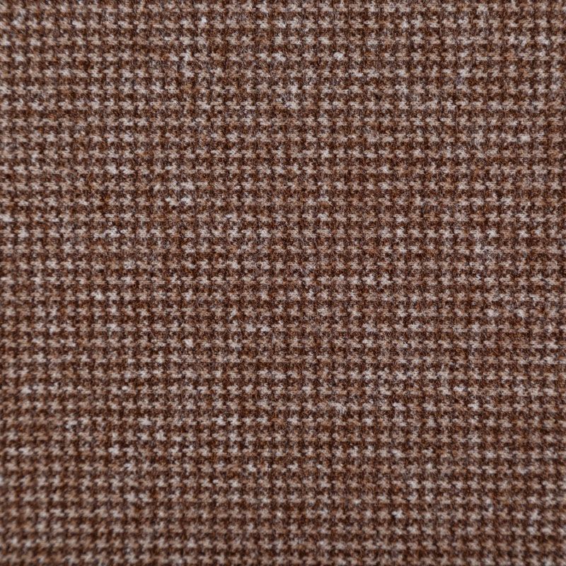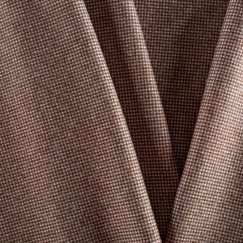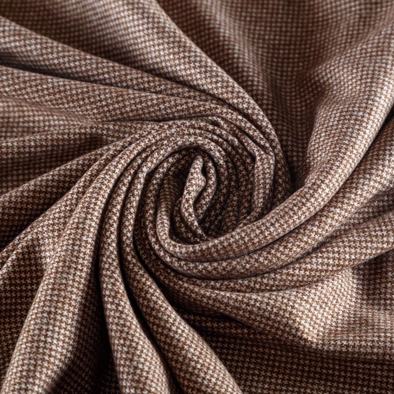 Трикотаж средней толщины, хорошо тянется за счет эластана в составе. Мелкий ненавязчивый узор "гусиная лапка" образуется переплетением нитей кофейного и молочного оттенков. Ткань не сухая, мягкая, но плотная, не просвечивает, теплая, уютная, хорошо драпируется. Отлично подойдет для пошива легкой верхней одежды, жакетов, костюмов, юбок.