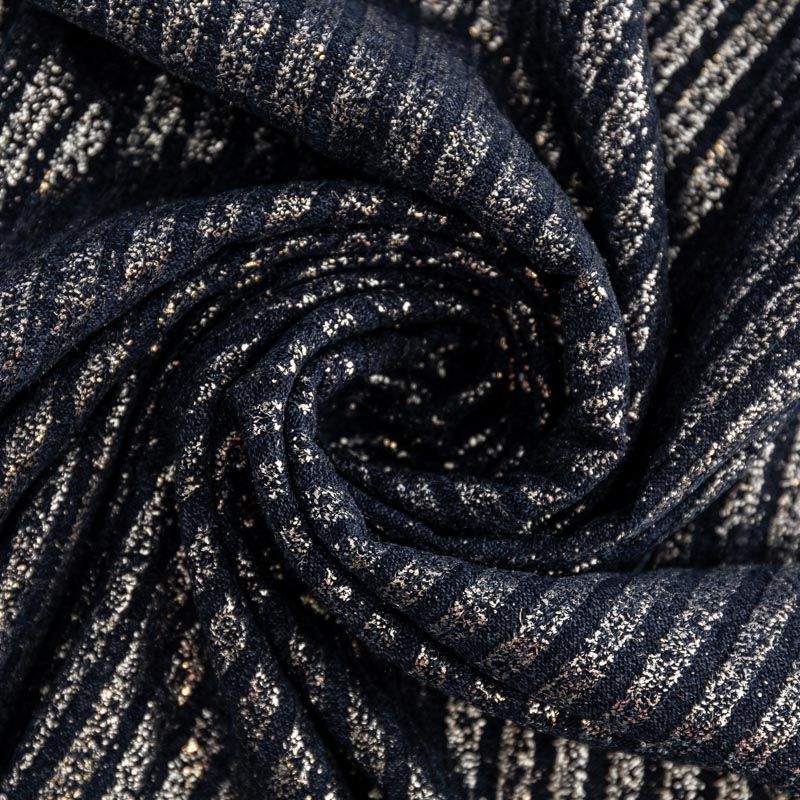 Трикотаж-лапша средней плотности, с высокой степенью эластичности, поверхность рельефная за счет эффекта резинки и мерцающая за счет металлизированного напыления. С изнанки трикотаж гладкий, комфортный, подходит для использования без подклада. Сшить из такого полотна можно водолазки, платья, топы, юбки, комплекты, нарядные изделия. Направление полос - вдоль линии кромки.
