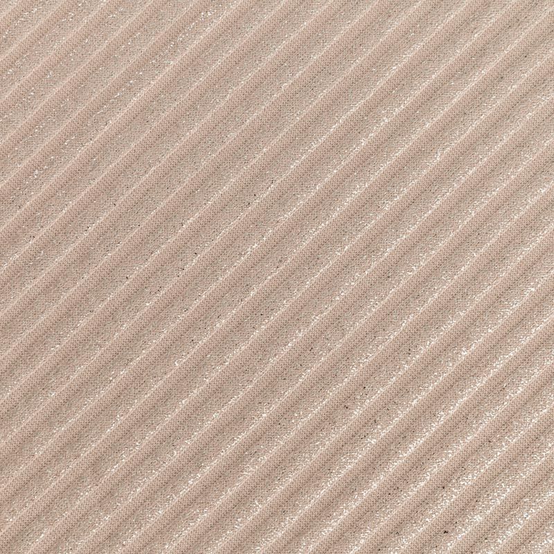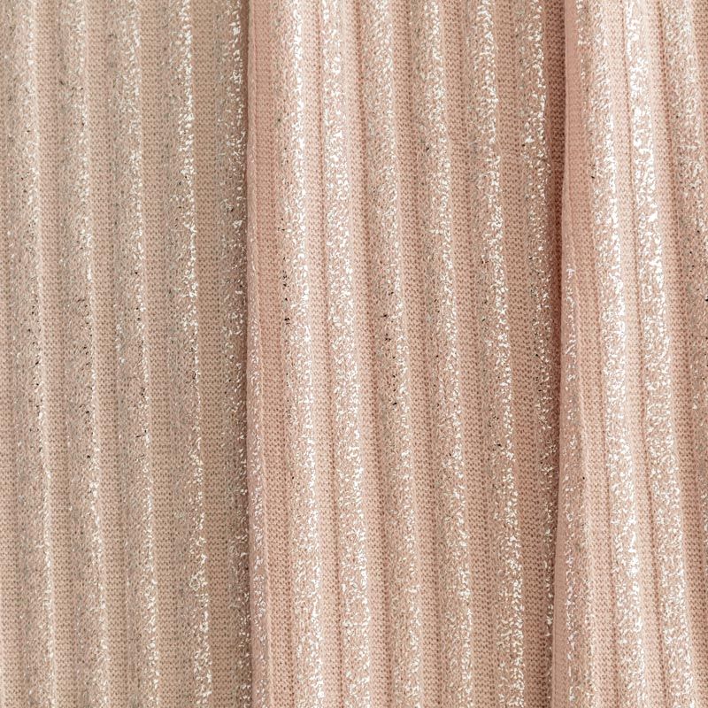 Трикотаж-лапша средней плотности, с высокой степенью эластичности, поверхность рельефная за счет эффекта резинки и мерцающая за счет металлизированного напыления. С изнанки трикотаж гладкий, комфортный, подходит для использования без подклада. Сшить из такого полотна можно водолазки, платья, топы, юбки, комплекты, нарядные изделия. Направление полос - вдоль линии кромки.