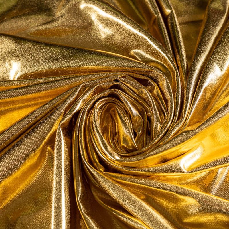 Эффектное трикотажное полотно с золотым металлическим блеском. Материал очень пластичный, образует струящиеся мягкие складки, отлично тянется, не просвечивает, не мнется. Изнаночная сторона матовая, приятная на ощупь. Идеальный выбор для нарядных моделей, гимнастических и танцевальных костюмов.