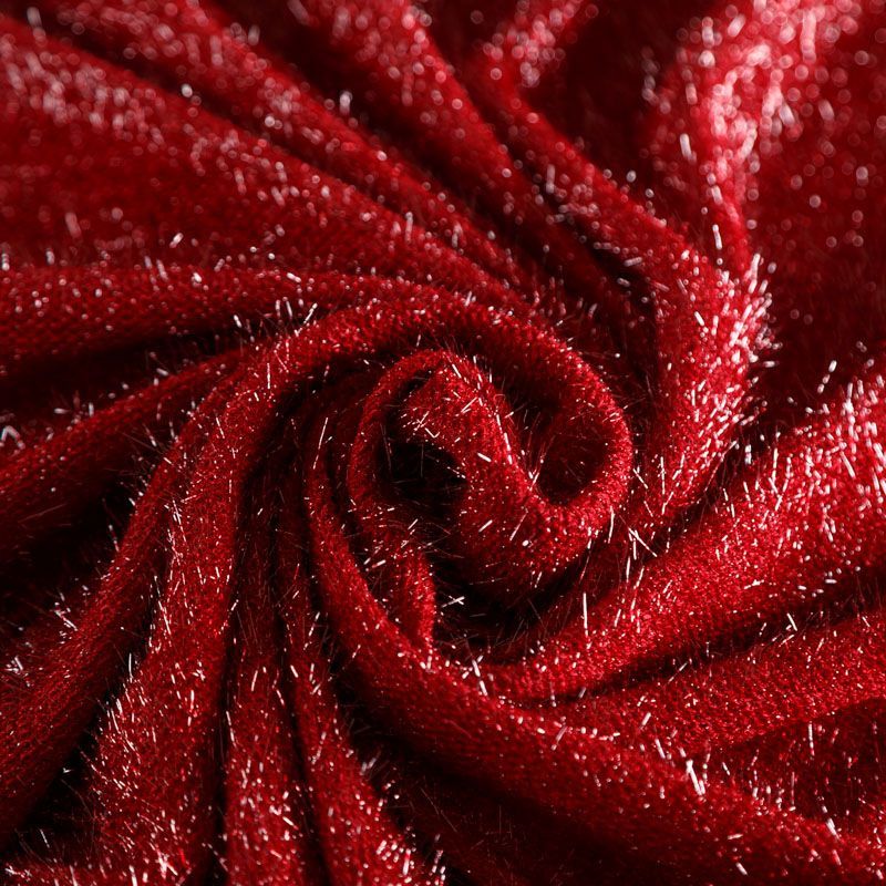 Нарядный трикотаж с люрексом в темно-красном оттенке. Полотно мягкое, пластичное, хорошо драпируется, не колется и не просвечивает. Подойдет для пошива логслива, топа, туники, платья, кардигана, юбки.