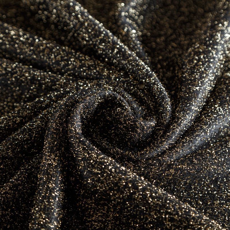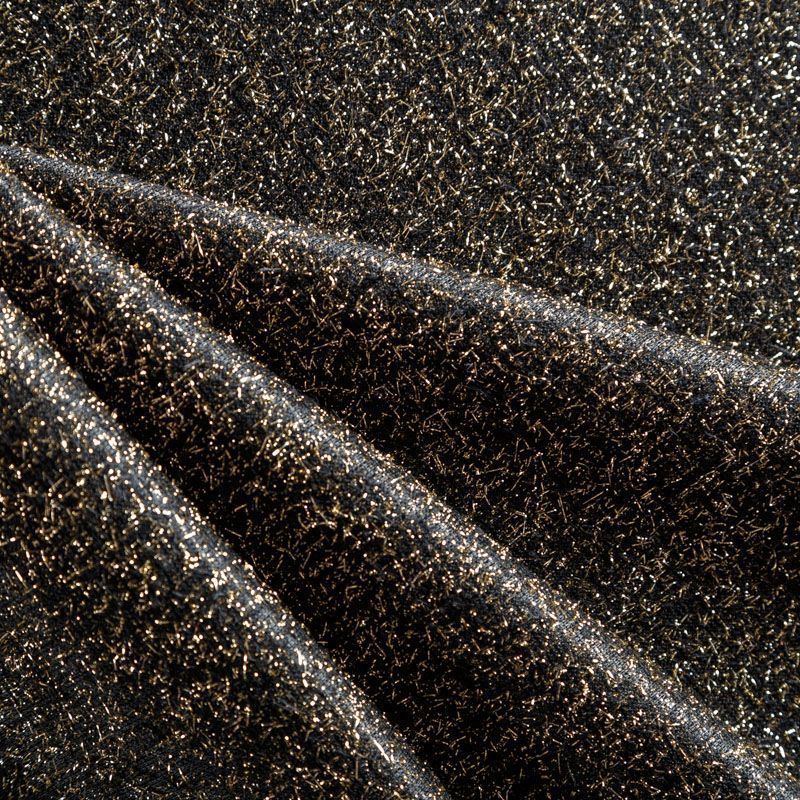 Нарядный трикотаж черного цвета с золотистым люрексом. Полотно мягкое, пластичное, хорошо драпируется, не колется и не просвечивает. Подойдет для пошива логслива, топа, туники, платья, кардигана, юбки.