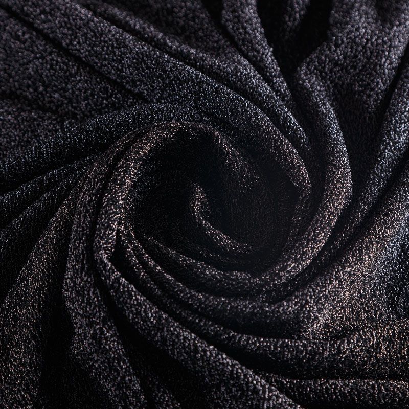 Трикотажное полотно с металлизированным блеском и  мерцанием. Люрексные нити вплетены в структуру полотна и создают объемный "вспененный" эффект, при этом изнанка гладкая и ровная. Ткань очень приятная к телу, не колется, не просвечивается, очень эластичная, отлично драпируется и ниспадает, красиво ляжет по фигуре. Идеальный вариант для пошива вечерних и нарядных платьев облегающего и свободного силуэта, топов, комбинезона, юбки, широких брюк, туник, кардиганов, накидок.