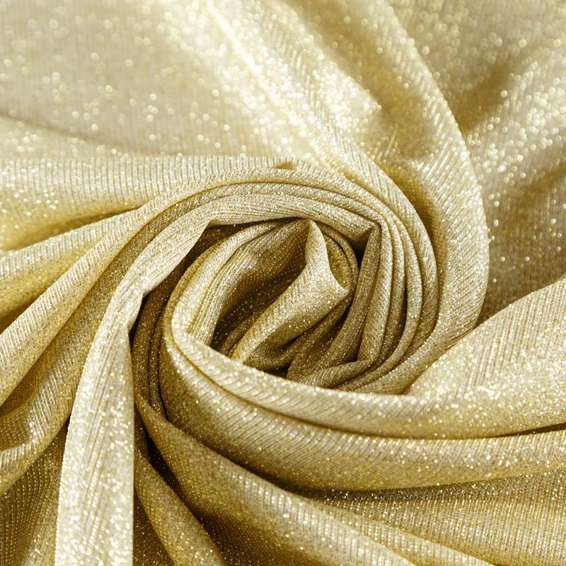 Трикотажное полотно средней плотности с добавлением золотистой люрексной нити. Поверхность шероховатая на ощупь, ткань пластичная, хорошо тянется, не просвечивает. Прекрасно подойдет для пошива лонгслива, гольфа, футболки, кардигана, жакета, платья или юбки в спортивном стиле.