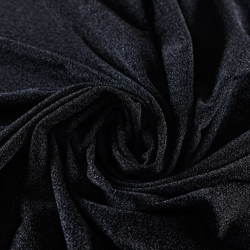 Трикотажное полотно с металлизированным блеском и  мерцанием. Люрексные нити вплетены в структуру полотна и создают объемный "вспененный" эффект, при этом изнанка гладкая и ровная. Ткань очень приятная к телу, не колется, не просвечивается, очень эластичная, отлично драпируется и ниспадает, красиво ляжет по фигуре. Идеальный вариант для пошива вечерних и нарядных платьев облегающего и свободного силуэта, топов, комбинезона, юбки, широких брюк, туник, кардиганов, накидок.