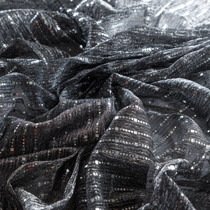 Мягкое и эффектное трикотажное полотно с люрексовой нитью металлизированными декоративными элементами. С лицевой стороны поверхность ткани  слегка шероховатая на ощупь, с изнанки трикотаж гладкий, комфортный. Отлично пододет для пошива водолазки, платья, топа, спортивных купальников, нарядных изделий.