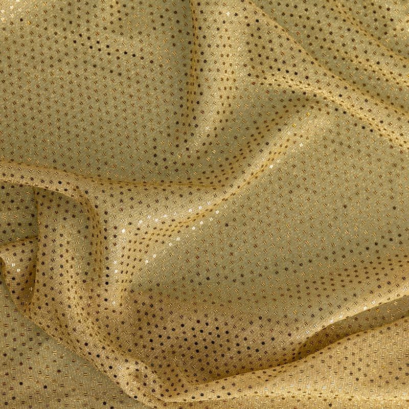 Трикотаж золотистого цвета с люрексовой нитью и мелкими пайетками. Мягкая и эластичная ткань, великолепно драпируется и красиво облегает. Тонкий, просвечивает, требуется подклад. Прекрасно подходит для изделий по фигуре, а также нарядов с мягкими складками. Трикотаж можно использовать для вечерних образов — платья, блузки, топы, кофточки и боди и для пошива танцевальных и сценических костюмов.