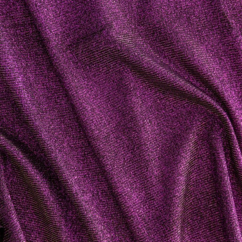Мягкое и эффектное трикотажное полотно с металлизированным напылением. Структура полотна плотная, легко растяжимая, эластичная. С лицевой стороны поверхность ткани  слегка шероховатая на ощупь, характеризуется заметным блеском «металлик». С изнанки трикотаж гладкий, комфортный, подходит для использования без подклада. Отлично пододет для пошива водолазки, платья, топа, леггинсов, спортивных купальников, нарядных изделий.